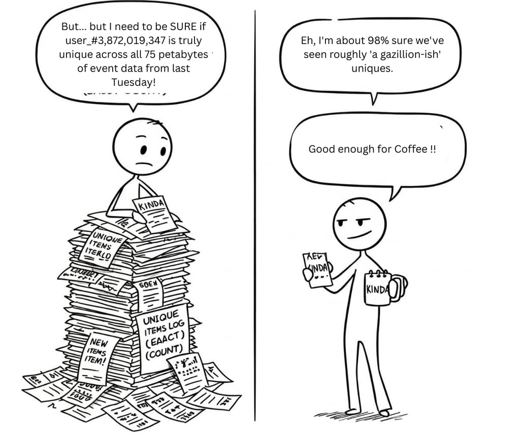 In the world of big data, seemingly simple questions can become surprisingly complex. One such question is: "How many unique items are there in this massive dataset?" Imagine trying to count the distinct visitors to a popular website, the unique words in a giant corpus of text, or the different IP addresses accessing your server. A naive approach of storing every unique item encountered quickly becomes unfeasible as datasets scale to billions or even trillions of entries. This is where probabilistic data structures like HyperLogLog (HLL) come to the rescue.